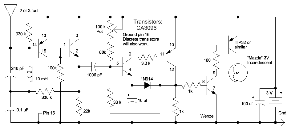 Here's another version that replaces the darlington transistor with a compound transistor consisting of a PNP and NPN transistor. This change allows the use of the venerable CA3096 transistor array. (Ordinary small-signal transistors may also be used. ) The 10 mH resonates with about 250 pF around 100kHz, a quiet frequency now that Loran-C is gone: