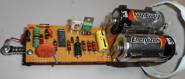 Some of the other parts in the prototype were chosen to make it easy for the beginner to see the values. For example, the large .1 uF "orange drop" can be a tiny ceramic type. Parts may be in odd positions, too. The orange 10 uF is twisted to make the markings visible and other parts are oriented to make viewing easy.