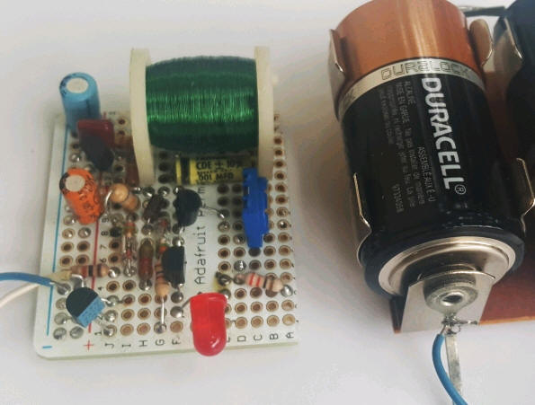 The coil and ferrite rod are from two eBay finds and measure 2.5 Henry shunted by 90 pF. I believe the coil is for pinball machine solenoids! Adding the 470 pF brings the resonant frequency down to 5 kHz, a great frequency for lightning energy but also just about as fast as this op-amp can go. The first op-amp is running "open-loop" since the gain-bandwidth and output slew rate can only support a gain of about 20 to 30 at 5 kHz. If you choose a much faster op-amp, add a resistor (around 22k) in series with the 4.7 nF and increase that capacitor to 0.1uF so that the gain is set by the resistor ratios. This micropower op-amp is slow but it draws only about 20 uA so the circuit can run on 3 C-cell batteries for quite a long time - except - it's so sensitive that it flashes quite often. I'd turn down the sensitivity, frankly. Right now it's flashing in response to a storm in Louisiana and I'm in Austin, Texas. That's just too much sensitivity. This prototype draws 24 uA when not flashing.