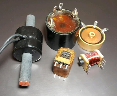 Bobbins from power transformers may also work but the core must be removed and optionally replaced by a ferrite rod or audio transformer laminated iron (only a straight "solenoid" core so that the external field gets in). The black coil above is from an industrial solenoid and the large #33 Amadon core brings the inductance up to nearly 1 Henry. I'm using the tiny one on the bottom right with good results. The pretty beige coil (an eBay find) measures about 50 mH. Use a good quality film or NPO ceramic capacitor to resonate your inductor. You can't use toroids, pot cores, or other cores that close the magnetic path back around the coil. You can probably use a relay coil if you remove all the metal pieces. Hook your prospective coil to a high-gain audio amplifier and if you hear distant lightning crackles you probably have a good candidate (assuming a storm is within a hundred miles or so). When indoors loud AC hum is another indication that the coil might be suitable.