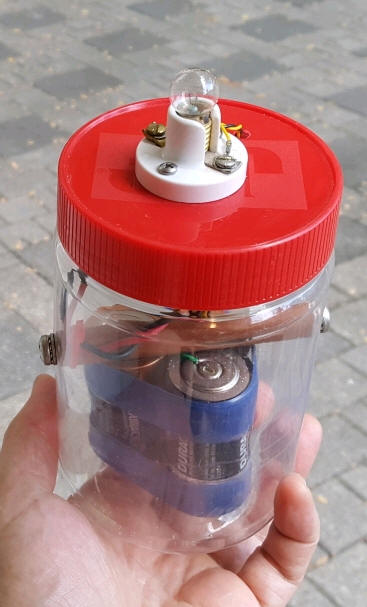 I stuck it in a peanut butter jar. A large standoff holds three D-cells taped together at the bottom of the jar and the circuitry is in the lid. The lamp screws into a Leviton socket so I can unscrew the bulb to save the battery during busy storms. One could replace the 2N2219 with a VMOS transistor (with very low turn-on voltage) and unscrewing the lamp would result in extremely low current even during a busy storm since there would be no base current (about 3 mA) during flashes. Even so, these batteries will last for years in my experience so I just soldered them in series, no battery holder and no power switch. It immediately started flashing and, sure enough, a storm is approaching from the northwest.