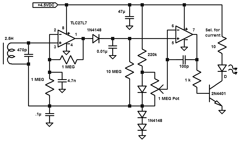Or run it on a power adapter, preferably linear to avoid possible interference from a switching regulator. Add a 5 volt linear regulator (LM7805) if necessary. I prefer the power hungry incandescent bulb; they just look better in this application, at least to me. The bottom two diodes provide a little positive voltage to bias the op-amps even though these particular ones can look below ground a little. I was a little worried about large signals exceeding the negative voltage input rating and I want plenty of swing to turn on the detector diode. It's tempting to use a micro-power voltage reference there. The top diode in the string generates a threshold voltage for the second op-amp that acts like a comparator. The horizontal diode rectifies the 5 kHz ringing signal from the tuned circuit and the .01u and 10 megohm stretch the detected pulse for a bright flash. The time-constant is plenty short to see lots of quick flashes in succession. Strong pulses light the lamp for longer. When using an LED the time-constant could be shortened by reducing the .01 uF capacitor.