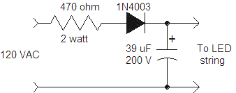 By the way, if the string doesn't light, reverse the wires between the LED string and the capacitor, the polarity does matter.