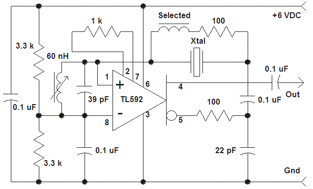 In operation, a rather large voltage is applied to pin 1. As a result, the differential amplifier is acting like a bandwidth-limited comparator, switching as quickly as it can. The large signal helps to reduce phase noise due to the amplifier's input noise. The crystal may be tuned over a wide range by the inductor and the range is somewhat a function of the amplifier gain. The prototype would tune 30 ppm with the 1k, 15 ppm with no gain resistor, and as much as 50 ppm with a 470 ohm gain resistor. Higher gain (lower value resistor) can lead to oscillation at one of the lower frequency crystal modes. The circuit was tested with a TL592 but the lower noise TL592B should also work. The output voltage is about 1 volt p-p but an additional buffer is recommended for driving a low impedance load. A single AC logic gate could be added as in the previous circuit. The variable inductor could be replaced with a fixed value and a combination of a trimmer capacitor and fixed value could replace the 39 pF.
