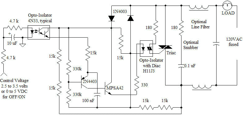 This line voltage power controller interfaces a DC control voltage or microprocessor logic output to an AC load. By adding a filter capacitor to the input resistors, the circuit may be controlled by a duty-cycle modulated square wave with about 2.5 volts average giving minimum brightness and 3.5 volts average giving full brightness.
