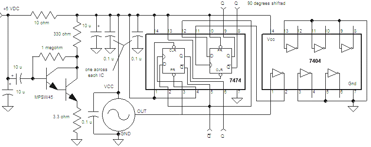 The oscillator is selected to be twice the desired clock frequency and can be as high as 20 MHz with HC devices. Choose AC devices for clock frequency above 20 MHz. The prototype's clock is operating at 1 MHz, producing 500 kHz signals. The photo shows one of the in-phase and quadrature outputs. Only one of the inverters of the '7404 is used, leaving the rest for other uses. They could be used to further buffer the clocks or to generate a multiplied frequency. If they are unused, the inputs should be grounded as shown.