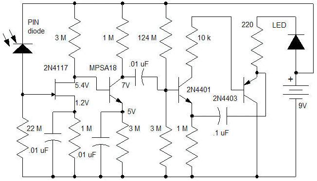When particles hit the PIN diode, tiny positive pulses appear on the gate of the 2N4417. These pulses are amplified by the 2N4117 and the MPSA18 and applied to a two-transistor monostable lamp flasher. The 2N4117 is biased by selection of the 1 megohm resistor in the source such that the drain is at least a couple of volts above the source. The drain is DC-coupled to the MPSA18 and it should have a couple of volts from collector to emitter, too. The actual values aren't particularly critical as long as there is a little voltage across the first two transistors; the pulses are pretty small. The 2N4401 is biased by two, 62 megohm resistors connected in series and a 3 meghom to ground so that the flasher circuit is on the verge of flashing. If the 3 megohm is too large, the LED will flash constantly and if the 3 megohm is too small, the circuit will not be sensitive. Other high value resistors may be used but the values should be well above 1 megohm and the ratio should be chosen such that the flasher is easily triggered by the amplified pulses. The flasher doesn't draw significant current when it isn't lighting the LED so the quiescent current is due to the first two amplifier stages and is only about 3 uA.