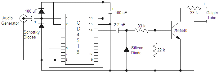 The two input diodes may be just about any schottky type or even older germanium diodes. The generator should be able to supply over 5 volts peak-to-peak. Higher amplitude is fine and will stretch the pulse width slightly. I vary the amplitude to modulate the pulse width when experimenting. The pulse width is also set by the 2.2 nF; increasing the value will increase the pulse width. The width is about 200 uS with the values shown in a typical Geiger counter circuit operating at 400 volts. The 2N3440 was chosen for high breakdown voltage with a 22k resistor connected from base to emitter. The prototype's transistor breaks down at about 600 volts, making this device useful for simulating tubes operating at up to 500 volts. The breakdown voltage was tested at a low current. Since the divider is wired to divide by 100, the counts per minute is equal to the frequency of the generator multiplied by 0.6. Setting the generator to 100 Hz will give 60 counts per minute. To simulate a higher voltage tube, a higher breakdown transistor will be necessary. Make sure to test the transistor's breakdown voltage with the 22k from base to emitter. The breakdown will be higher than with the base open but lower than with the base connected to the emitter directly.