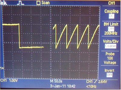 Below is a scope screen of the voltage on the source of the JFET. The first portion of the scope display shows a single reset and slow drift due to leakage and background radiation, and the second portion shows the sawtooth waveform when I place a piece of uranium ore near the chamber. I eventually adjusted the source resistor to get achieve 1.5 volts p-p (2.5 volts p-p in photo).
