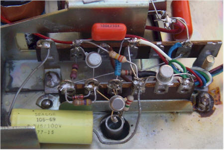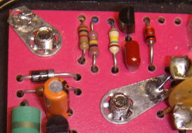 The 3.3 uF can be any value above 1 uF and it connects between circuit ground and the case. Remember, the case is at +50 volts! The 2.2 megohm and three diodes can be directly soldered to the guard tube. My "three" diodes are in a single package (old GE MPD300) and it is obscured by the metal JFET. Metal transistors were used instead of plastic ones, but just about any general-purpose types will work.