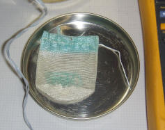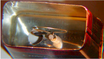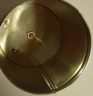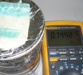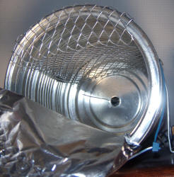 Since the original construction of this meter, a couple of useful modifications have been made. A wire shelf was added to allow items to be inserted into the chamber through a small hole in the foil without fear the item will touch the center pin. (The foil is peeled back to reveal the shelf in the photo to the left.) Later I realized it's better to put the "shelf" at the bottom so that the inserted item rests on the can with the screen simply acting as an electrostatic shield and physical guard.