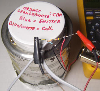 Connect two wires to the collector and emitter leads. The picture shows a length of solid copper telephone cable used for the connections. The two blue conductors are connected to the transistor legs and the two orange wires are connected to the can. The blue wires are given a little slack so that the cable pulls on the can connection and not on the transistor legs.