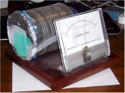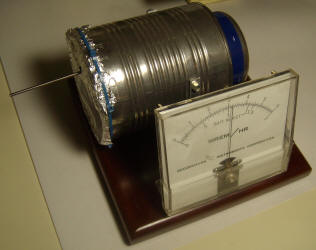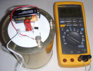 If the room temperature increases a little, both sides leak more current but the voltage across the meter stays about the same. The 10k resistors are not necessary but are included to protect the transistors from inadvertent shorts during testing. Another 10k resistor between the battery voltage and the outer can is probably a good idea in the event the can is shorted to the base of the transistor. The schematic shows 12 volts but a 9 volt battery works fairly well. The higher voltage sweeps the ions out of the chamber faster, before they have a chance to recombine so the meter reading will be a little higher at 12 volts. The sensitivity is good; the photo shows the response to a radioactive mantle held about an inch away from an aluminum foil window on the end of the chamber. Construction of the chamber is similar to the earlier devices except the metal end cap from a spool of resistors is used for the shield. This end cap accommodates a multi-pin header that is used to hold the components and also acts as a feedthru. The ion chamber sense wire is soldered directly onto the base of the transistor and is suspended in air by the transistor without additional support. It might be a good idea to use a plastic bead to hold the wire more securely but this unit is well-behaved as-is. The meter should read upscale slightly but, if it doesn't, try connecting the sense wire to the other base and reverse the meter leads. If it still doesn't read a little above zero, clean the transistors with acetone. If that doesn't work, try new Darlington transistors since you probably have a leaky one. Hold a radiation source near the aluminum foil window and the reading should quickly climb. The meter can be a 1 volt digital panel meter or even a digital multimeter set to the 1 volt scale.