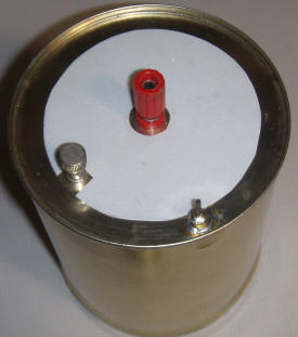 This experimenter's chamber is made from a 4" (10 cm) diameter, 5.5" (14 cm) tall tin with a tight-fitting lid. A 5-way binding post is mounted in the center of the can and a 4" (10 cm) wire is suspended from the post inside the can. The wire length is short enough to insure that it doesn't touch the lid. Another all-metal binding post and pin are installed in the bottom of the can, and a sheet of gray insulating plastic is glued into place to keep hastily constructed experiments from contacting the can. The electrometer circuitry will be extremely sensitive to stray electric fields, so a shield is mandatory. Another can previously containing mints is pressed into service:
