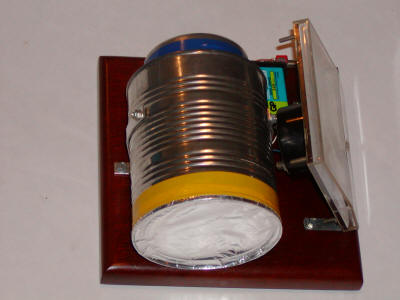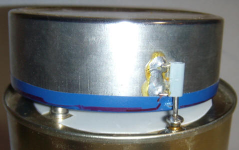 It is easier to paint the cans first then touch up the solder connections later. Try a Q-tip dipped in a little of the spray paint. The finished unit shown below is ever-vigilant on the shelf of the author's bomb shelter, at least long enough to make the picture, anyway.