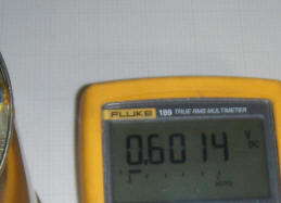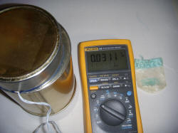 To observe the background and leakage level, the lid is placed on the bottom, the top shield is added and the reading is allowed several minutes to stabilize. The meter settles to a little over 30 mV and exhibits an occasional jump. A camping lantern mantle known to contain radioactive thorium is place in the lid of the chamber, and the lid is secured on the open end of the can such that the mantle is inside the chamber. The meter reading climbs to over 600 mV: