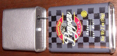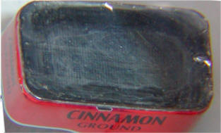 The larger pepper can houses the battery and LED. The battery holder is fashioned from balsa wood strips secured with epoxy and a battery door is cut into the bottom of the can with an abrasive cutting wheel (see photo below). The LED is held in position by its anode lead which is soldered directly to the can. A blue plastic "mosaic" piece from the art store covers the LED hole.