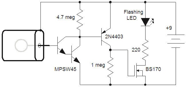 The schematic features a front-end like the experimental chamber above but without the current-limiting resistor connecting the can. It should be a less likely to accidentally touch the base of the transistor to the can since the unit is sealed and connecting the can directly to the battery makes wiring the rest of the circuit a bit simpler. A 1 megohm resistor can be used in place of the wire to connect the base to the pickup loop to protect the transistor, if desired. Instead of a meter, the MPSW45 pulls current from the base of a 2N4403 which further amplifies the current and turns on the BS170 by raising the gate voltage. When the FET is on, the LED with the built-in flasher begins to flash.