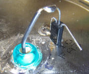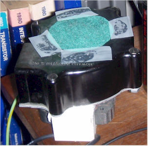 Another way to use the gadget is to simply place it in the room to be tested and let it run for a few hours. Then position it up against the ion chamber and make a measurement. It can touch in this case, since no air is flowing. The reading will settle after a couple of minutes. The radiation level will begin to drop after about 15 minutes so don't take too long. Since these isotopes are all but exhausted after a few hours, the filter may be used over and over, until it becomes dusty enough to restrict air flow. The filter should not cause a reading increase when held against the ion chamber at the beginning of a test before the fan has run. If it does, it may be time to change the filter. I simply affixed mine with scotch tape.