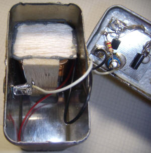 The resistor is connected on the other end of the orange wires. A mint tin is tacked to the coffee can in a couple of places to act as a shield and a wiring reminder is written on the back of the mint tin. A little optional notch is seen near the bottom of the mint tin that allows the phone cable to exit the tin without being pinched. The opening of the coffee can is covered with ordinary kitchen aluminum foil held in place by an elastic band.