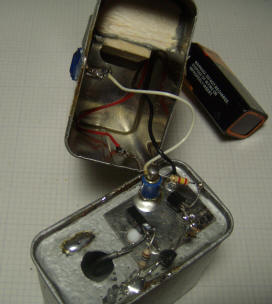 After the pickup loop and wire are installed, the can is closed with a piece of tinned PCB material soldered in a few places. Other solderable metal will also work.