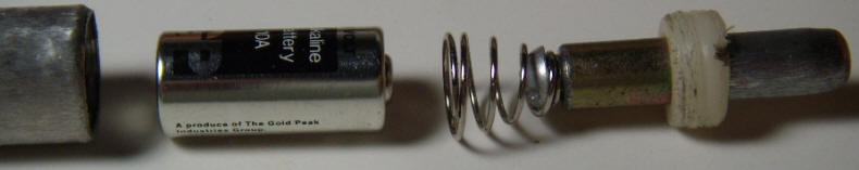 The other battery contact was made from a spring stolen from a AA cell battery holder fastened to a 1" steel standoff. The screw fits inside the spring and holds the narrow end of the spring to the standoff. The wide end of the spring friction fits in the steel tube to make contact. It is nicely centered by the tight fit and doesn't touch the center contact of the battery. When the button is pressed, the head of the screw makes contact with the battery's positive terminal, completing the circuit. The standoff "button" is held in place by a homemade nylon bushing that screws into the steel tube. (Threading the stainless steel was difficult! And fashioning the bushing from a nylon rod was no picnic.) The end of the standoff that protrudes was ground down to match the steel case after cutting off enough to eliminate the threaded hole. The steel case was given a coarse sanded finish, too, to hide all the scratch marks from the threading process! The brushed finish actually looks nicer than the original shiny finish and it hides fingerprints. This isn't the easy way to build such a pen but it gets the idea across.