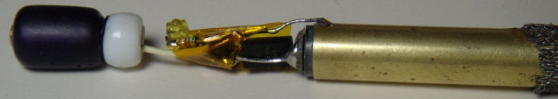 The swab was dipped in epoxy, inserted up to the black mark, and the epoxy was swabbed along the inside wall of the outer tube. After the epoxy was applied to the inside of the steel case, the assembly was slid into place (bead first) and the LED was positioned to face out the hole. After the epoxy set, conductive silver paint was gingerly applied to the edges of the screen to hold the ion chamber in position and to ensure a good electrical connection to the outer tube.