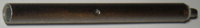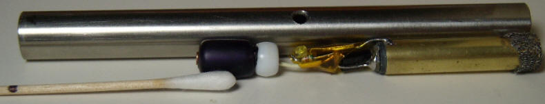 The outer tube was fashioned from 1/2" stainless steel tube, but copper would have been much easier to machine. The assembly was placed next to the tube to locate the hole for the LED, and a cotton swab was marked for depth with a black marker for applying epoxy to the inside of the tube to hold the glass bead battery terminal.