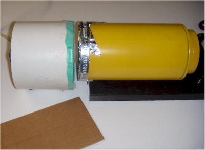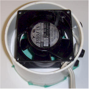 An ordinary computer case fan is mounted in one end of a 4" PVC plumbing coupler as shown. This particular fan is held in place by friction but any technique is fine, as long as it pulls air through the coupler. A white poster board doughnut is secured with some foam caulking to seal the gaps along the edges of the fan. The fan is oriented to pull air through a filter affixed to the other end of the coupler with tape. The filter in the picture is a piece of 3M SV-DF01 dusting cloth but other thin dusting or cleaning cloths that will allow a little airflow will also work.
