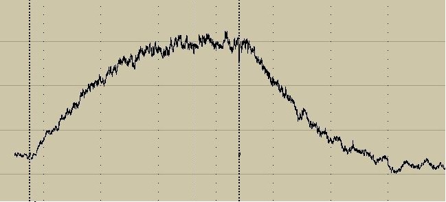 The faint dotted lines are an hour apart and the vertical sensitivity corresponds to about 10 fA of chamber current per division. The fan is turned on at the first marker and turned off at the second marker just after the middle of the plot. The height of the response will depend on the level of radon in the vicinity, the velocity of air through the filter, and a host of other variables. It would be hard to calibrate the response but it could be useful for checking the relative levels in different parts of a house or for periodically checking for significant level changes. Seeing the exponential helps to validate the detection.