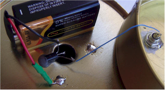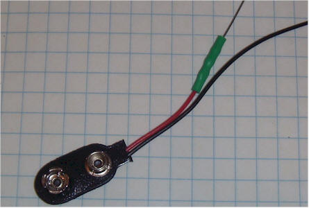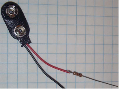 Solder a 1k resistor in series with the positive (red) battery snap lead and cover it with heat shrink tubing or electrical tape. This resistor may be left out, but accidentally shorting the transistor base lead to the can will destroy the transistor. The resistor is a good idea!