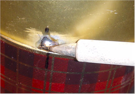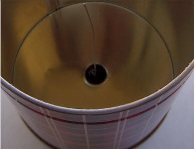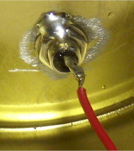 Drill a 1/4 inch hole in the bottom of the short can near the edge. The location is not critical. Use fine sandpaper or a rotary tool to remove the enamel coating around the hole on the inside of the can so that the washer will make electrical contact. Mount the RCA phono jack in the hole. It is hard to tighten such a connector in thin metal without damaging the connector or bending the can. So, optionally, snug it up reasonably tightly and solder the nut to the can and threads to keep it in position. Other connector types will work. Simply running the wire through the hole is adequate, but you will need an additional wire for the can connection.
