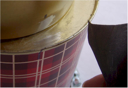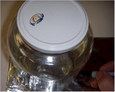 Find a circular object with a slightly larger diameter than the ion chamber can and use it to draw a circle on a piece of aluminum foil. Sand the paint off the lip of the can so that the aluminum foil will make electrical contact. You may try to use a rubber band or tape to affix the foil but it is difficult to let go of the band without destroying the foil. After you destroy a few pieces and learn a few new words, try a large pipe clamp. Make sure the foil is pulled tight against the sanded lip of the can so that electrical contact is made.