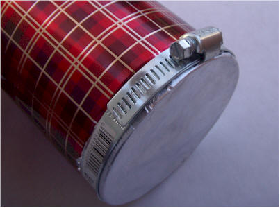 Pipe clamp: Found in any hardware store. The aluminum foil window may also be taped on with electrical tape, but make sure the foil is snug against the lip of the can so that it makes electrical contact. The clamp will allow the foil to be replaced with screen for detecting air ions or alpha particles.