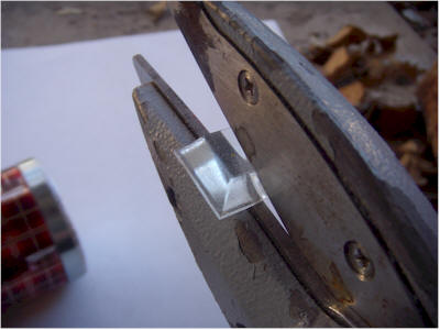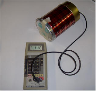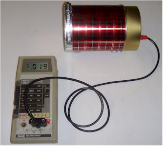 The chamber is finished! Connect it to a digital voltmeter set to the 1 or 2 volt scale. The reading should drop to a few tens of millivolts, depending on the room temperature. In the cool laboratory, the background reading is 19 millivolts. Taping an older thoriated lantern mantle to the foil window increases the voltage reading to 116 mV! Remember, most newer lantern mantles don't contain thorium.