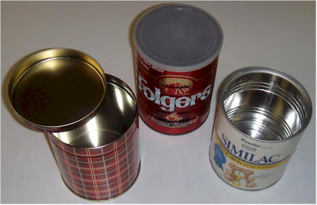 First, acquire an empty metal can about 5 inches tall, with a 4 inch diameter to be used as the ionization chamber. Typical cans include a small coffee can, a baby formula can, or a holiday snack tin. The size is not critical. Also find another short tin with a slightly smaller diameter with a height of 1.25 inches or a little more. These tins are commonly used for hard candy. This smaller can will shield the electronics. It is necessary to shield the circuit from external electric fields.