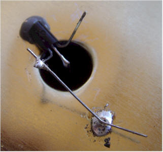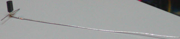 Apply a small amount of epoxy to the top end of the transistor, keeping the epoxy well away from the leads. IMPORTANT! Don't get the epoxy on the center lead! Other NPN darlington transistors will work well in this project but the MPSW45A has an extra-tall package, making it easier to keep the epoxy away from the legs. Pass the long wire into the can and press the flat side of the transistor against the outside bottom of the can, allowing the epoxy to spread onto the can. You may solder a temporary wire to the can to help hold the transistor while the epoxy cures. Check to make sure the center lead is free from any epoxy.
