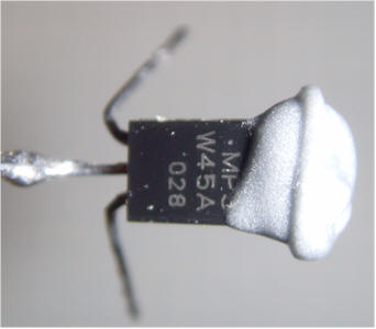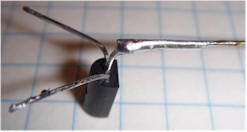 Bend the base lead (middle pin) of the MPSW45A Darlington Transistor at a right angle, extending away from the flat side of the body. Solder a piece of solid, 22 or 24 AWG bare wire to the base lead. Cut the bare wire to be shorter than the ion chamber can by 3/4 inch.