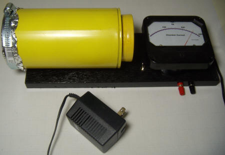 The long super cap time constant is clearly seen and the absence of noise is refreshing. Such extra-long averaging times would be useful for testing samples slipped directly inside the chamber, too, but the casual experimenter may wish to shorten the response time a bit by choosing lower value caps. Although the schematic doesn't show it, a double-pole switch was eventually added to disconnect one leg of each super capacitor for those times when a fast response is desired. Also, keep in mind that the circuit will take a long time to settle after power is first applied and much longer when the super caps are used. The meter will peg for several minutes and adjusting the zero with the caps switched in can be tricky since it takes many minutes to see the results of an adjustment. With experience, the speed of the drifting can allow the zero to be set with the caps connected. Simply try to stop the meter. Then very, very slowly adjust the needle to a low reading, perhaps 20% of full-scale. Expect to be "lost" once or twice with such a long time constant!