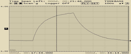 The ionization chamber works about as well as can be expected without significantly more care in chamber design. The long averaging time makes it possible to see radiation from very weak sources. Below is a plot of the response when a radioactive lantern mantle is rested up against the foil window then removed five minutes later: