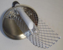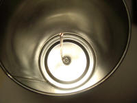 If you use the chamber as-is you might have a roughly calibrated unit but if you want maximum sensitivity to any radiation, you may want to modify your chamber. I unsoldered the chamber holding it over the stove (after removing the solder plug in the center to let out pressure). It took two oven mitts and a bit of effort. The heat partially melted the internal plastic liner and the exhaust fan was quickly turned on. I removed the liner and the metal plate, drilled a large hole in the lid, nearly the full diameter, and replaced the disc electrode with a wire loop: