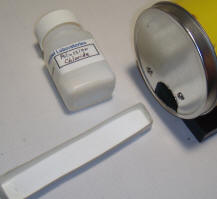 A wire tray was built onto the original lid and a hole was cut so that items could be inserted into the chamber right above the center wire without opening the chamber. Power should be removed when installing or removing the tray to prevent shorting the outer can to the center wire. The tray is useful for observing the radiation from long objects like thoriated tungsten electrodes or test tubes filled with radioactive substances. If a coarse mesh is used the circuit will respond to the slight change in electric field when an item is inserted, so some settling time will be required. Experience has shown that observing the change when the item is removed instead of inserted gives better results. Heavy items will cause the tray to bend toward the wire slightly, so it is best to flip the lid 180 degrees so that the inserted item rests on the bottom of the can with the screen above. If the chamber is mounted with sheet metal screws through the bottom as with this prototype, twist the lid slightly so that inserted items miss the screws. An open paper tray allows the observation of radiation from alpha and beta emitters. The tray in the photo below is made from thin cardboard and is filled with potassium chloride, a beta emitter. The low level of radiation is just detectable using the long averaging and a computer plot, giving about a 20 mV change.
