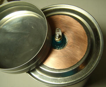 PCB material was cut to fit well inside a mint can cover, and a center hole was