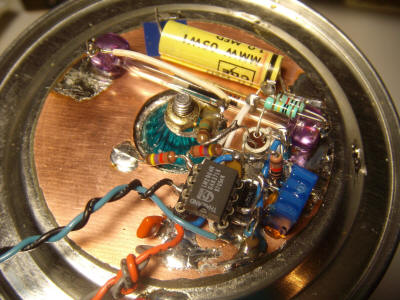 The op-amp circuit is built on a piece of tinned copper-clad board. One op-amp is used to generate V/2 (4.5 volts) and the other is the feedback amplifier. I used two single micropower op-amps but a dual CMOS type would be fine. I like micropower types to give the best battery life but an ordinary LM358 should be fine.