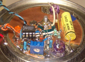 | A word of caution: the metal sure looks like ground and a person (um, like me) might start soldering components that go to ground to it. The can will actually be connected to +45 volts or more so the "ground" connections are made above the metal. The only components that connect to the can in the photo are a large yellow cap and a couple of white caps used to support my elevated ground buss. | ![]() |