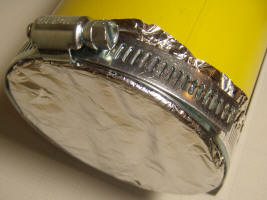 The cans were painted yellow, but provisions must be made to make good electrical contact between the chamber can and the end cap which can be aluminum foil, wire screen, etc. The prototype has a short length of tinned copper shield braid soldered to the inside of the can and folded over the lip of the opening: