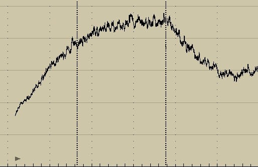 The vertical scale is 10 fA per division with the peak of the data just touching the 40 fA line. The horizontal scale is 1 hour per division. The output was relatively steady at about 15 fA when the chart was started. The fan was started at the first marker. The radiation exponentially approached a peak of about 40 fA, representing the equilibrium point where the decay of the accumulated isotopes equaled the rate of accumulation of new ones. The fan was turned off at the second marker. The radiation from the filter exponentially returned to the lower value, suggesting a composite half-life for the various isotopes to be about one hour.