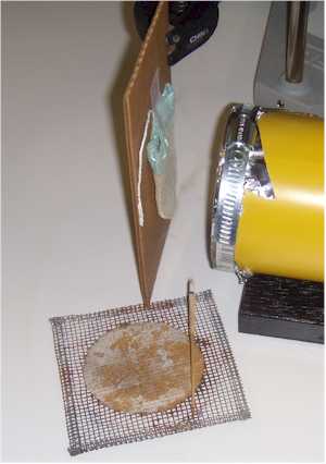 The ion chamber is spaced a uniform, repeatable distance from the filter by spacing it with a piece of single-ply corrugated cardboard which is subsequently removed, leaving a gap so that air can easily reach the filter paper. The end of the ion chamber is sealed with ordinary kitchen aluminum foil which is thin enough to let through many of the beta particles and gamma rays. A quick test of the apparatus is shown below: