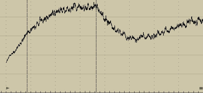 To see if smoke would have an effect on the concentration of isotopes on the filter paper, a single stick of incense was lit in the room and a quick, qualitative plot was made. Keep in mind that the fan was NOT turned off as it was in the plot above. The drop occurs with the fan running. The incense was lit at the second marker n in the plot below: