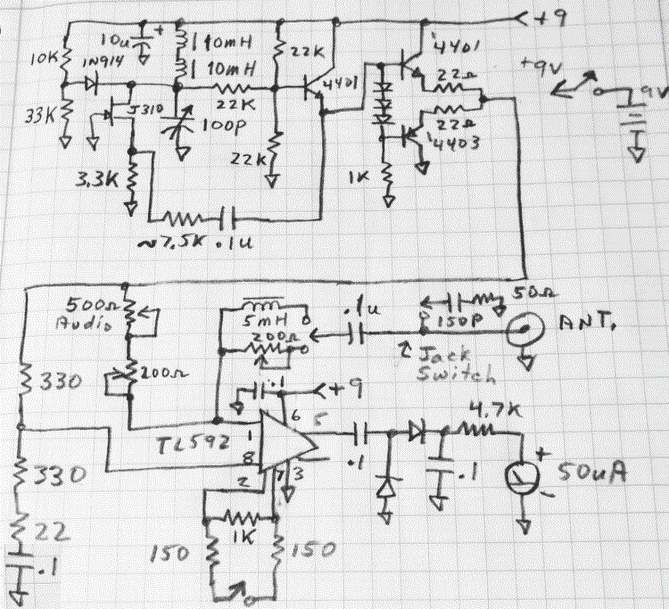 Note the "circuit trick" where I have the high gain switch at the ends of two equal-value resistors. When the switch is open, the gain is low and there's less chance of the long wires causing destabilizing feedback. But when the switch is closed and the gain is much higher, the long wires have little signal because each resistor goes to opposite polarity voltages (the two emitters in the differential amp). So, even though the gain is high, there's little feedback signal radiating from the wires. That's the idea, at least.